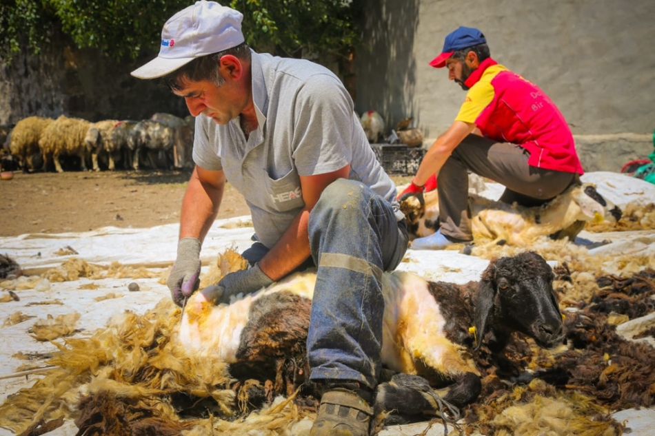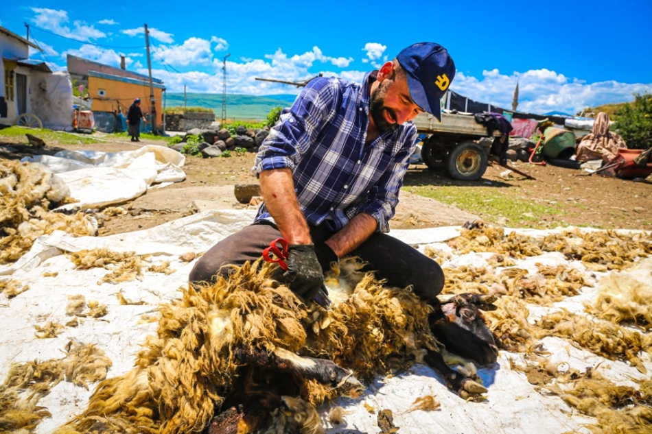 Çıldır ilçesinde yaylada bulunan koyun sürülerinde kırkım dönemi başladı.