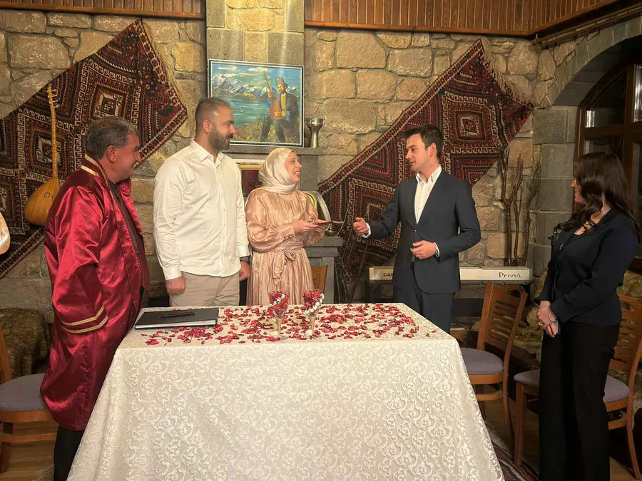 Çıldır Taş Konakta gerçekleşen nikahı Çıldır Belediye Başkanı adına Yazı İşleri Müdürü Güven Korkmaz gerçekleştirdi. Nikah Şahitliğini İlçe Kaymakamı Barış Aytürk ve İlçe Milli Eğitimde görevli Memur Nihal Aykovanın yaptığı törene evlenen çiftlerin mesai arkadaşları katıldı.